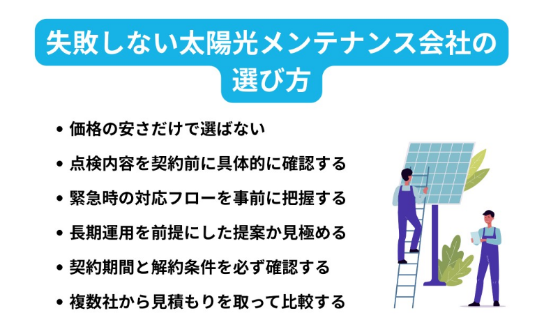 太陽光メンテナンス会社選びで失敗しないためには、価格や知名度だけで判断せず、「長期運用を任せられる体制があるか」という視点で見ることが重要です。