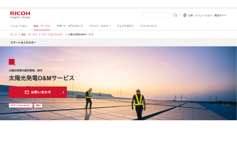 リコージャパンは、太陽光発電設備向けに遠隔監視と保守対応を組み合わせたO&Mサービスを提供している大手企業です。24時間365日の監視体制をベースに、異常発生時のアラート通知や現地対応の手配までを含むパッケージ型の運用支援を行っています。