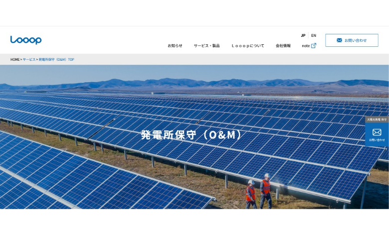 Looopは、太陽光発電の開発・運営から小売電気事業まで幅広く手がける企業で、発電所の運用・保守に関しても自社でO&Mサービスを提供しています。低圧から高圧、さらには特別高圧まで対応範囲が広く、主任技術者の選任、遠隔監視、定期点検、緊急時の駆けつけ対応、除草や設備周辺の環境整備までを一体でカバーできる点が特徴です。