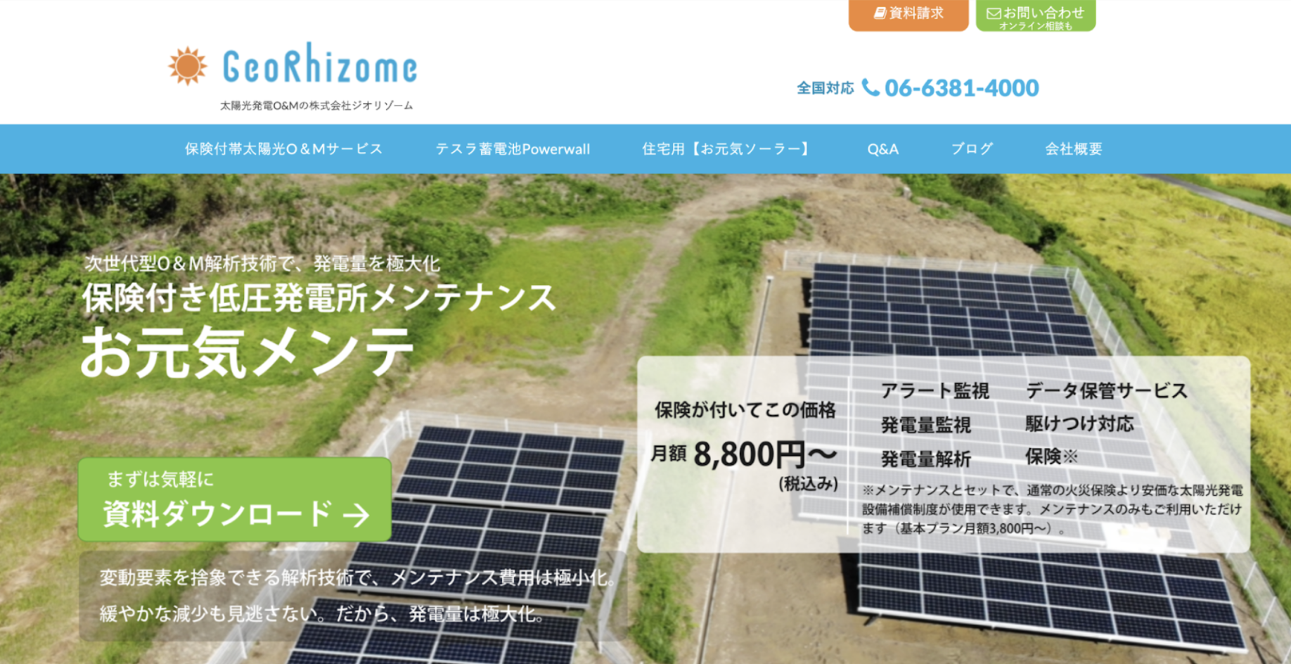 発電量解析でメンテナンス費用をミニマムにする「お元気メンテ」のメンテナンス内容、費用対効果や事例について詳しくはこちら。保険&メンテの無料診断も実施中